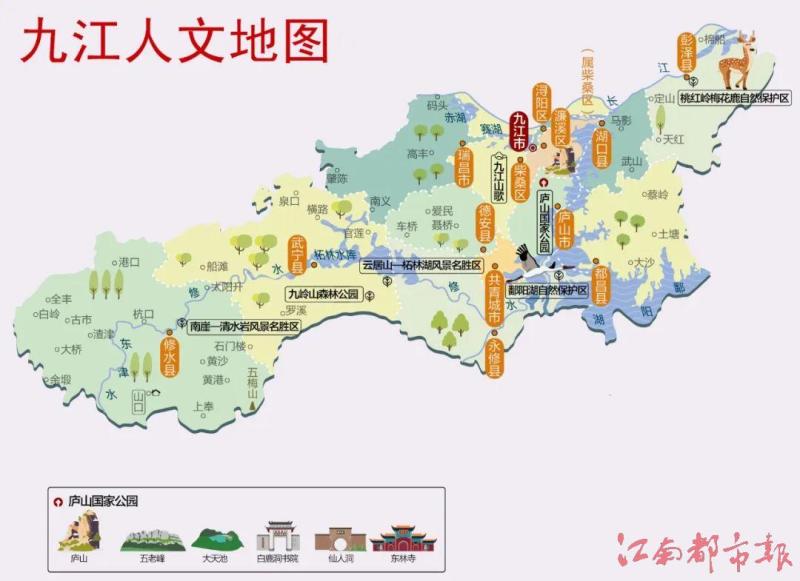 九江古稱柴桑、江州、潯陽,有著五千年文明史和兩千多年的悠久歷史,文化底蘊(yùn)厚重,2022年3月獲評(píng)國家歷史文化名城。九江是中華大地的一個(gè)重要節(jié)點(diǎn),“天下眉目之地”,是八百里鄱陽湖與萬里長(zhǎng)江的交匯處,是引南接北、承東啟西的黃金十字口,集名山、名江、名湖、名城于一身,是江西水陸交通的重要樞紐和省域副中心城市。目前,九江境內(nèi)有各級(jí)文物保護(hù)單位522處,其中國重點(diǎn)文物保護(hù)單位20處、省級(jí)文物保護(hù)單位105處,一般不可移動(dòng)文物2369處,詩詞歌賦數(shù)不勝數(shù)。在這眾多優(yōu)秀人文資源中,我個(gè)人認(rèn)為以下十張文化名片最為突出,值得我們好好總結(jié)和推廣。