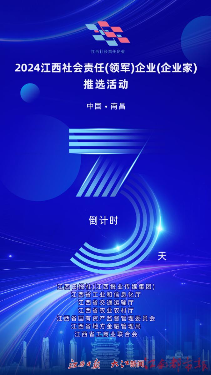 倒計(jì)時(shí)三天!2024江西社會責(zé)任(領(lǐng)軍)企業(yè)(企業(yè)家)推選活動將于9月5日在南昌舉行!敬請期待!