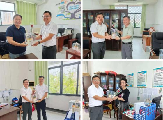 每到一個(gè)辦公室,張校都熱情地向老師問好,和大家親切握手,談工作、拉家常,并將精心準(zhǔn)備的節(jié)日蛋糕和鮮花送到老師們手中。歡聲笑語充滿了每一個(gè)角落,溫馨感人的畫面隨處可見。