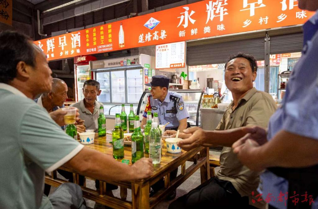 當日頭升高,早市的人潮如潮水般退去,攤主們開始收拾碗盞,民警的工作卻未結(jié)束。他們協(xié)助清理通道,檢查有無遺留火患或安全隱患,確保集市平穩(wěn)收尾。除了派出所,早酒集市的繁榮離不開當?shù)鼐游瘯臓款^組織和日常維系。轄區(qū)民警定期主動上門,與居委會干部碰頭互通治安動態(tài)和預(yù)警信息,傾聽攤主、游客的訴求,共同分析研判風險點,聯(lián)合開展實地巡查,將隱患消除在萌芽。